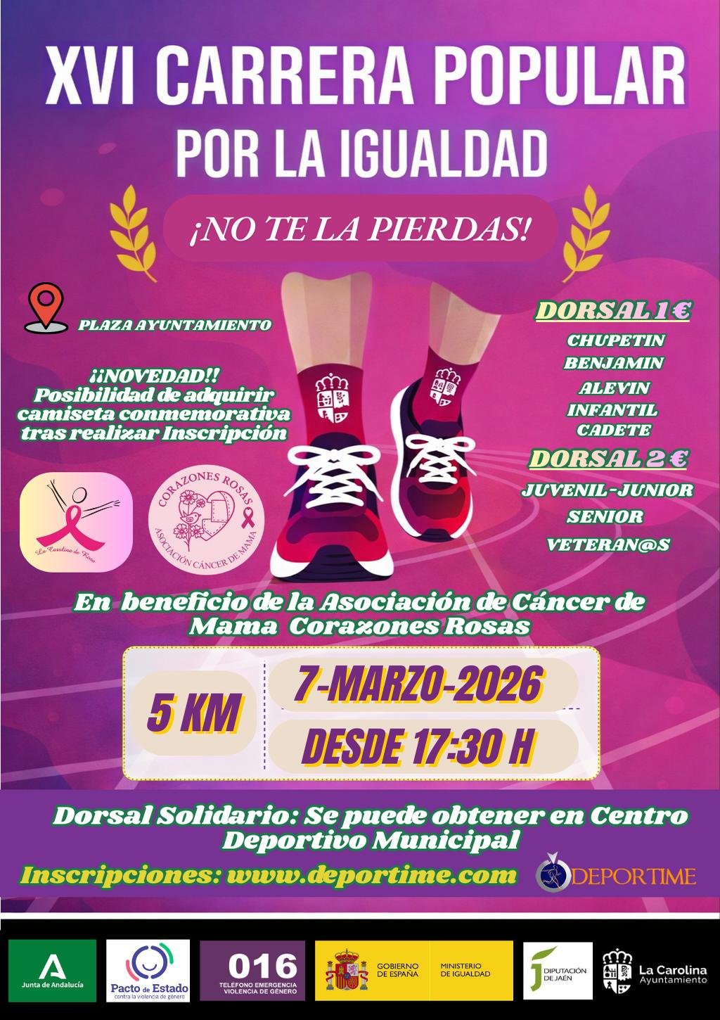 El Ayuntamiento de la Carolina junto al Grupo apoyo cancer La Carolina celebrará una carrera solidaria con motivo del 8M, uniendo a la ciudadanía en una jornada llena de compromiso, energía e igualdad.